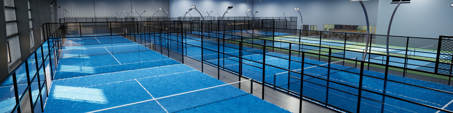- Glass-enclosed padel court installations